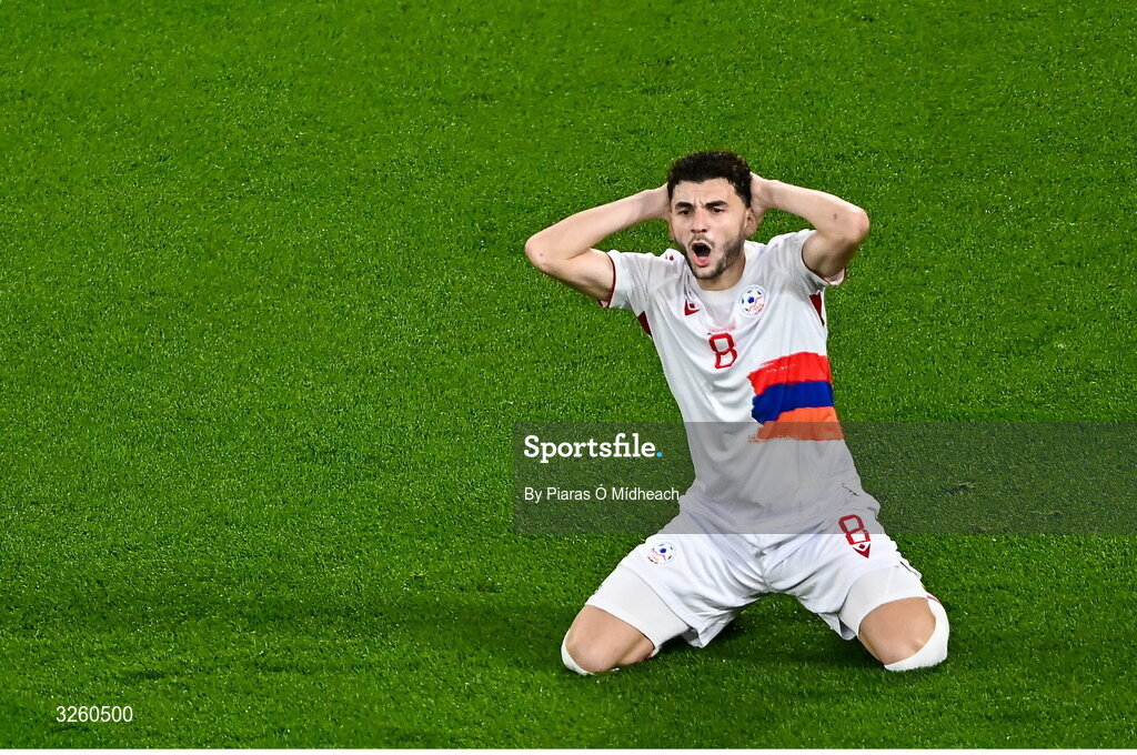 14 October 2025; Eduard Spertsyan of Armenia reacts to a missed shot on goal during the FIFA World Cup 2026 Group F qualifying match between Republic of Ireland and Armenia at the Aviva Stadium in Dublin. Photo by Piaras Ó Mídheach/Sportsfile