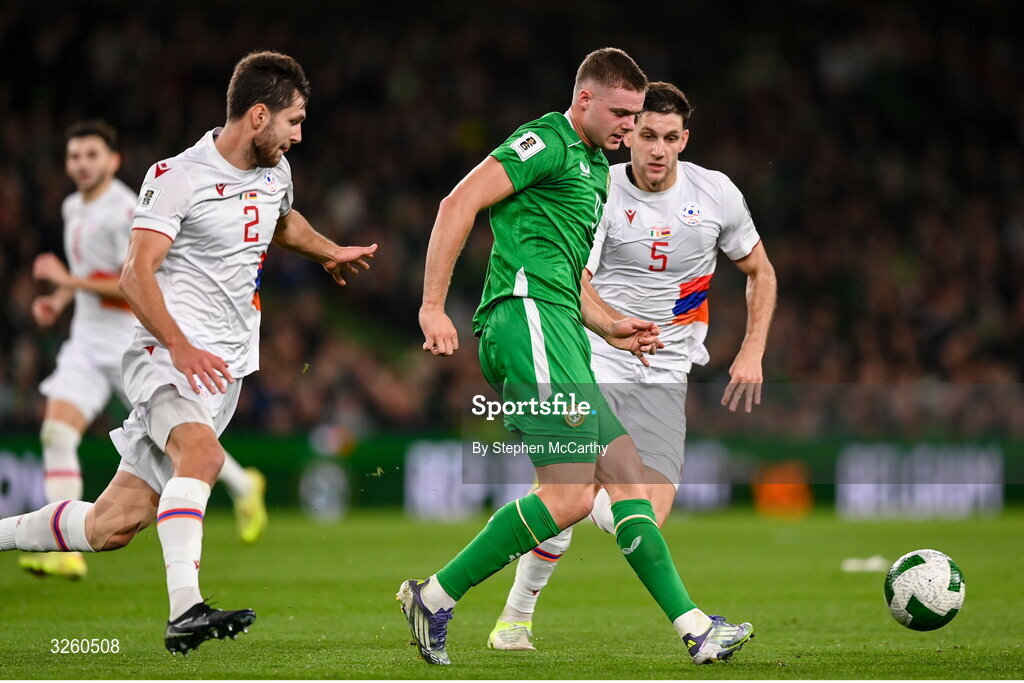 14 October 2025; Evan Ferguson of Republic of Ireland in action against Sergei Muradian, left, and Styopa Mkrtchyan of Armenia during the FIFA World Cup 2026 Group F qualifying match between Republic of Ireland and Armenia at the Aviva Stadium in Dublin. Photo by Stephen McCarthy/Sportsfile