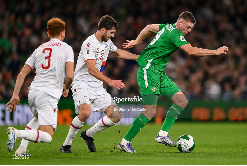 14 October 2025; Evan Ferguson of Republic of Ireland in action against Sergei Muradian, centre, and Erik Piloyan of Armenia during the FIFA World Cup 2026 Group F qualifying match between Republic of Ireland and Armenia at the Aviva Stadium in Dublin. Photo by Stephen McCarthy/Sportsfile