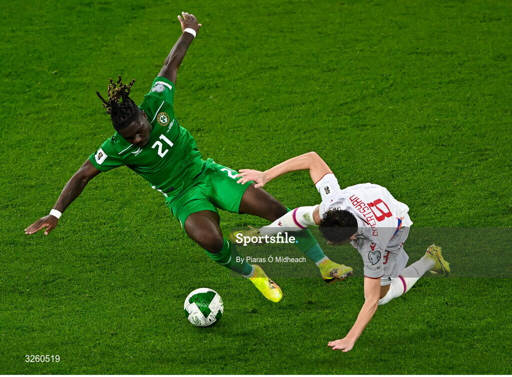 14 October 2025; Festy Ebosele of Republic of Ireland in action against Eduard Spertsyan of Armenia during the FIFA World Cup 2026 Group F qualifying match between Republic of Ireland and Armenia at the Aviva Stadium in Dublin. Photo by Piaras Ó Mídheach/Sportsfile