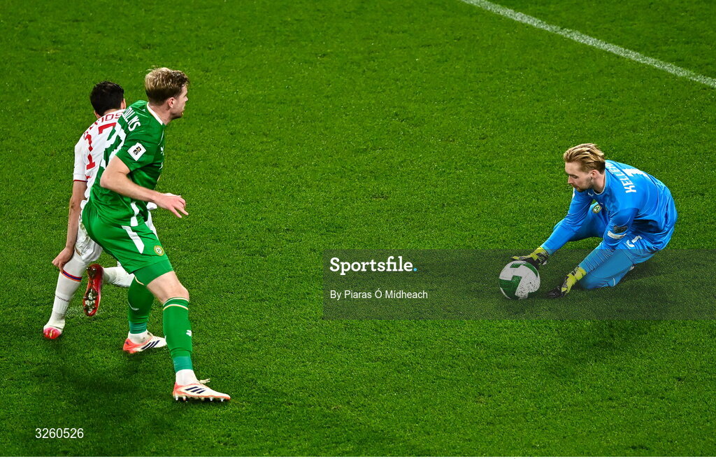 14 October 2025; Republic of Ireland goalkeeper Caoimhin Kelleher makes a save during the FIFA World Cup 2026 Group F qualifying match between Republic of Ireland and Armenia at the Aviva Stadium in Dublin. Photo by Piaras Ó Mídheach/Sportsfile