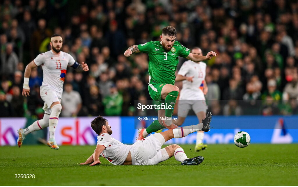 14 October 2025; Ryan Manning of Republic of Ireland is tackled by Sergei Muradian of Armenia during the FIFA World Cup 2026 Group F qualifying match between Republic of Ireland and Armenia at the Aviva Stadium in Dublin. Photo by Stephen McCarthy/Sportsfile
