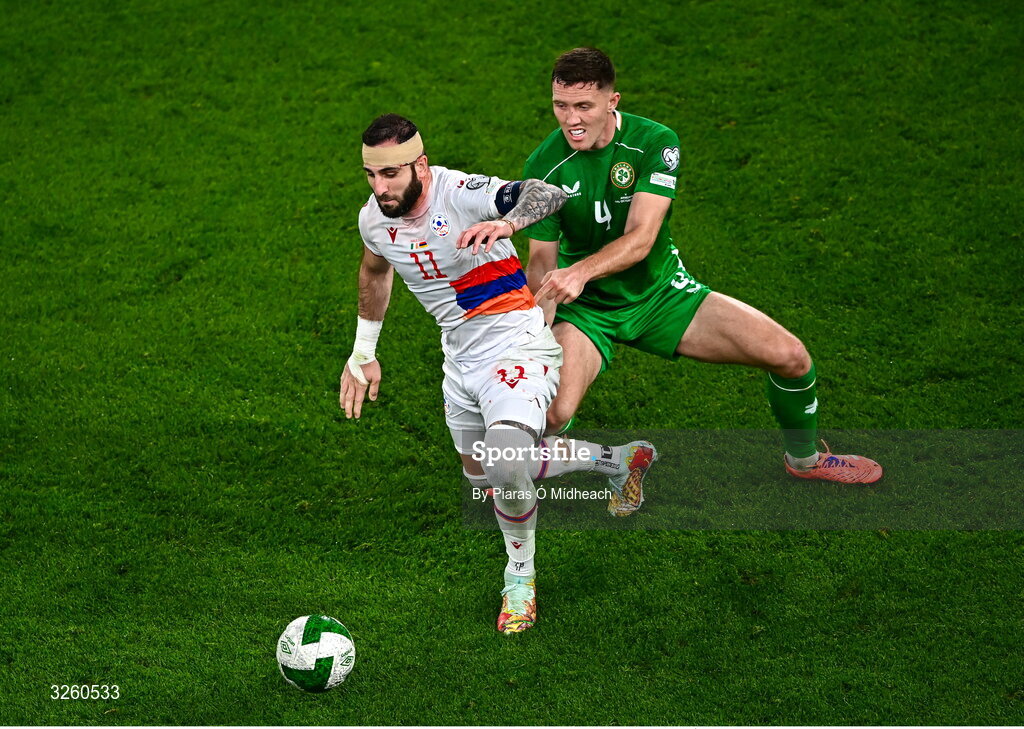 14 October 2025; Tigran Barseghyan of Armenia in action against Dara O'Shea of Republic of Ireland during the FIFA World Cup 2026 Group F qualifying match between Republic of Ireland and Armenia at the Aviva Stadium in Dublin. Photo by Piaras Ó Mídheach/Sportsfile