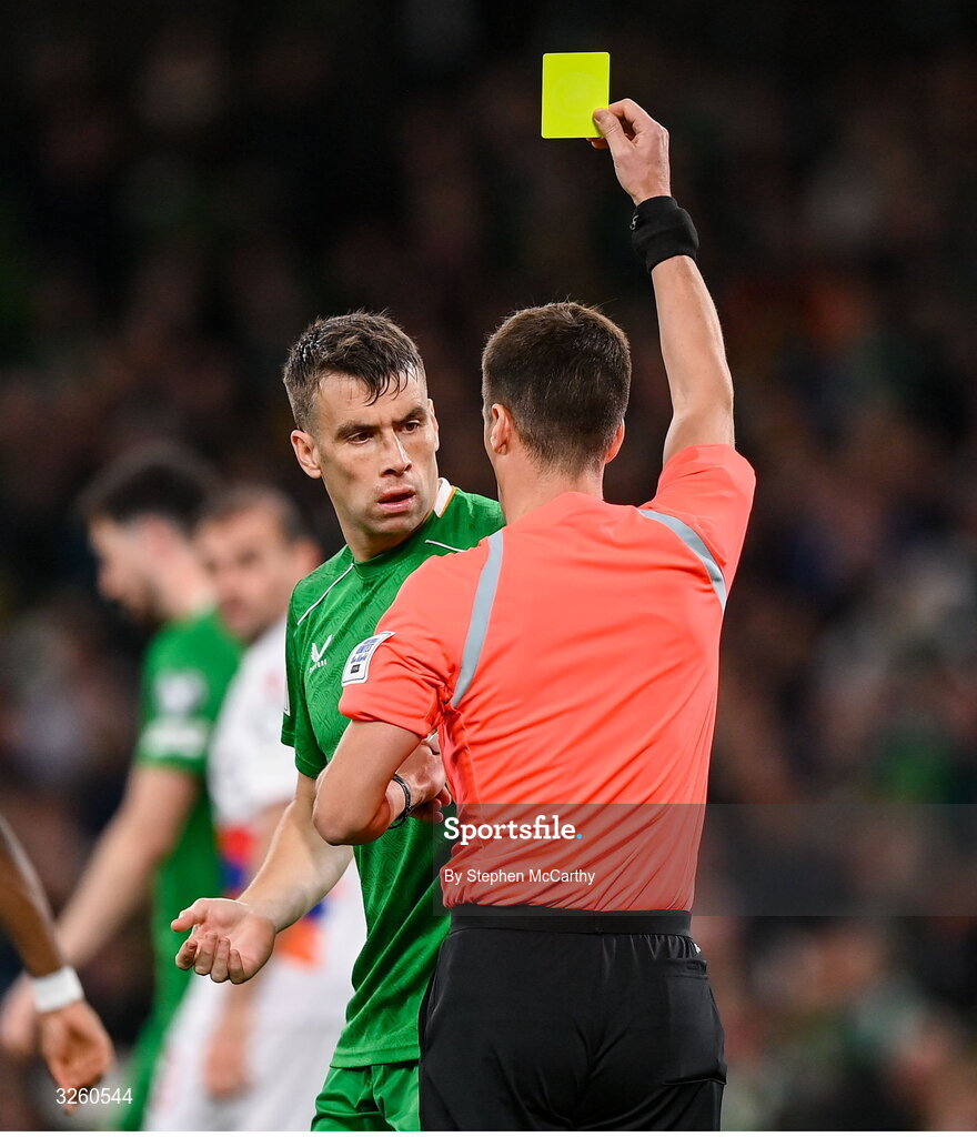 14 October 2025; Referee Benoît Bastien shows a yellow card to Seamus Coleman of Republic of Ireland during the FIFA World Cup 2026 Group F qualifying match between Republic of Ireland and Armenia at the Aviva Stadium in Dublin. Photo by Stephen McCarthy/Sportsfile