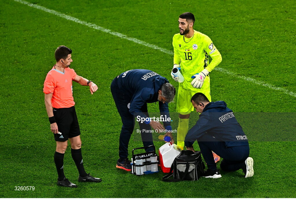 14 October 2025; Armenia goalkeeper Henri Avagyan recieves medical attention as referee Benoît Bastien checks the time on his watch during the FIFA World Cup 2026 Group F qualifying match between Republic of Ireland and Armenia at the Aviva Stadium in Dublin. Photo by Piaras Ó Mídheach/Sportsfile