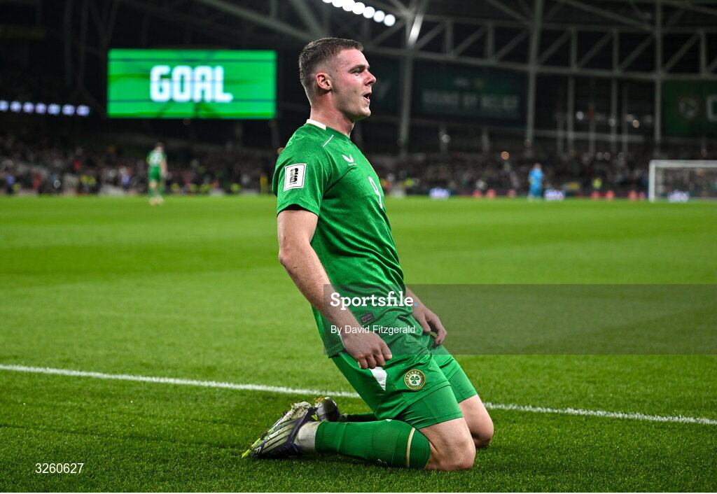 14 October 2025; Evan Ferguson of Republic of Ireland celebrates after scoring his side's first goal during the FIFA World Cup 2026 Group F qualifying match between Republic of Ireland and Armenia at the Aviva Stadium in Dublin. Photo by David Fitzgerald/Sportsfile