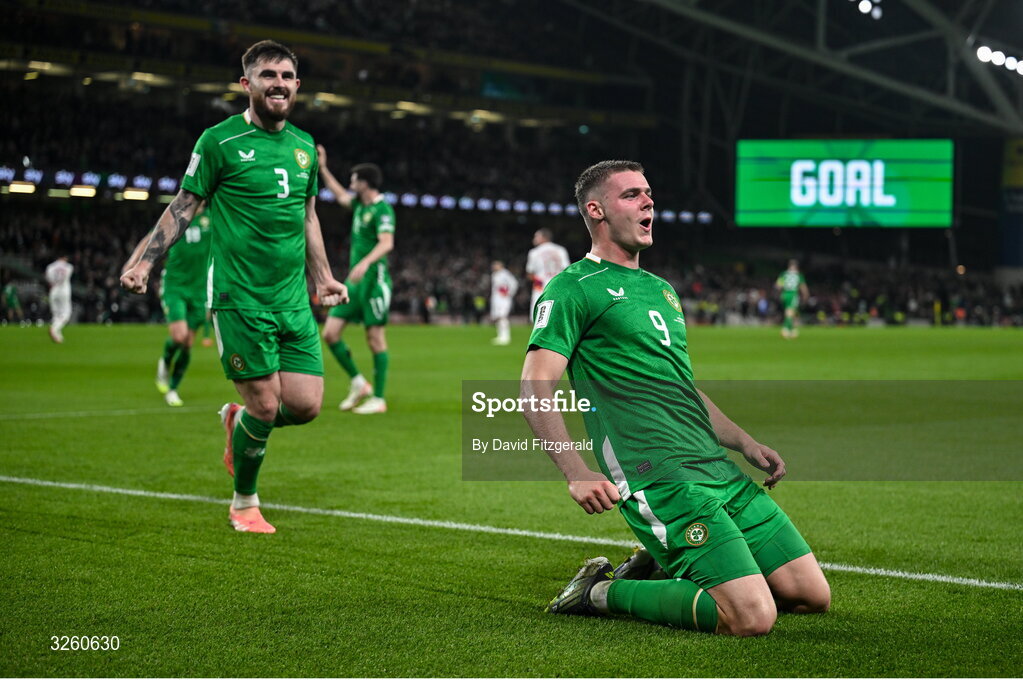 14 October 2025; Evan Ferguson of Republic of Ireland, right, celebrates after scoring his side's first goal during the FIFA World Cup 2026 Group F qualifying match between Republic of Ireland and Armenia at the Aviva Stadium in Dublin. Photo by David Fitzgerald/Sportsfile