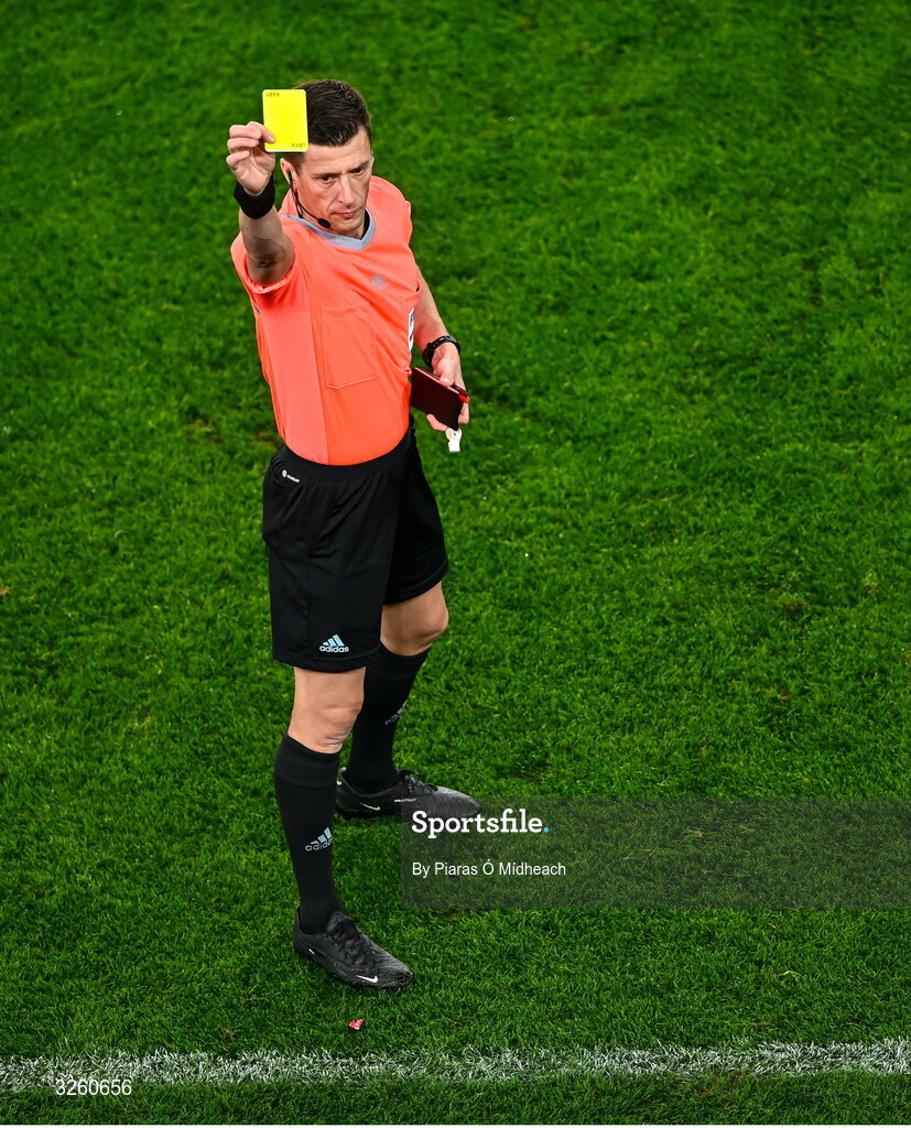14 October 2025; Referee Benoît Bastien shows a yellow card to Republic of Ireland assistant head coach John O'Shea during the FIFA World Cup 2026 Group F qualifying match between Republic of Ireland and Armenia at the Aviva Stadium in Dublin. Photo by Piaras Ó Mídheach/Sportsfile