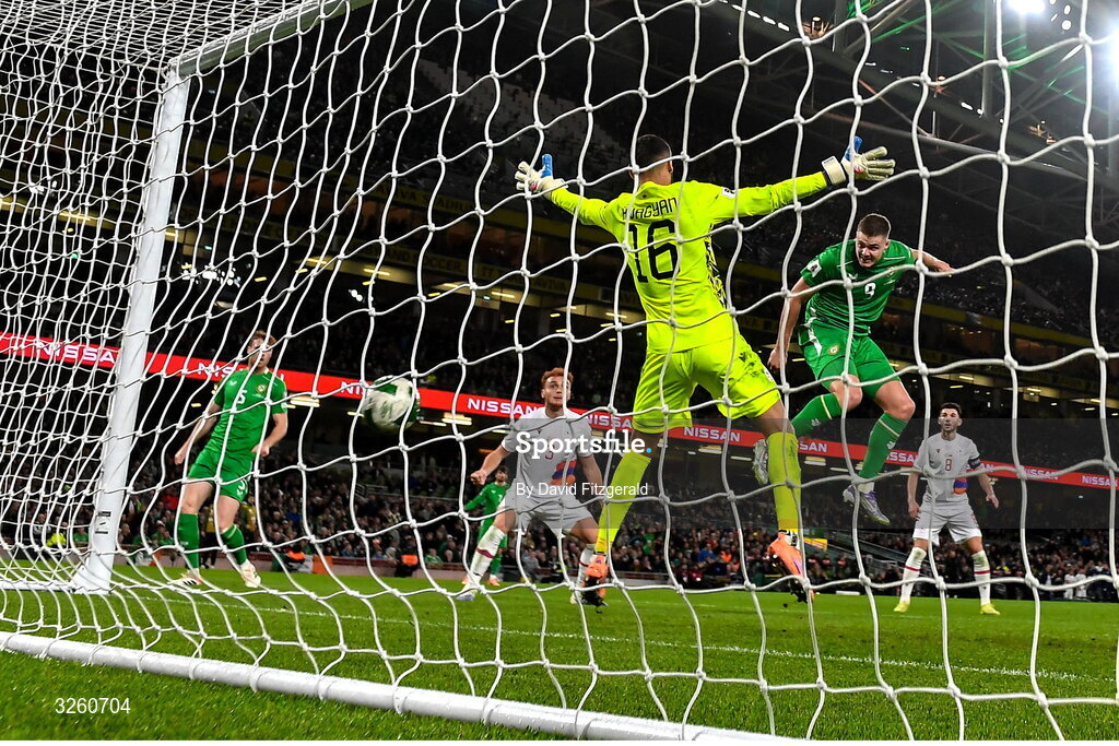 14 October 2025; Evan Ferguson of Republic of Ireland heads to score his side's first goal during the FIFA World Cup 2026 Group F qualifying match between Republic of Ireland and Armenia at the Aviva Stadium in Dublin. Photo by David Fitzgerald/Sportsfile