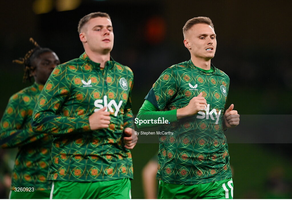 14 October 2025; Will Smallbone, right, and Evan Ferguson of Republic of Ireland before the FIFA World Cup 2026 Group F qualifying match between Republic of Ireland and Armenia at the Aviva Stadium in Dublin. Photo by Stephen McCarthy/Sportsfile