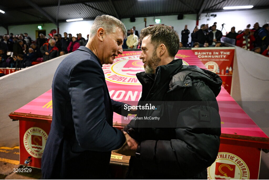 17 October 2025; Shamrock Rovers manager Stephen Bradley, right, and St Patrick's Athletic manager Stephen Kenny before the SSE Airtricity Men's Premier Division match between St Patrick's Athletic and Shamrock Rovers at Richmond Park in Dublin. Photo by Stephen McCarthy/Sportsfile