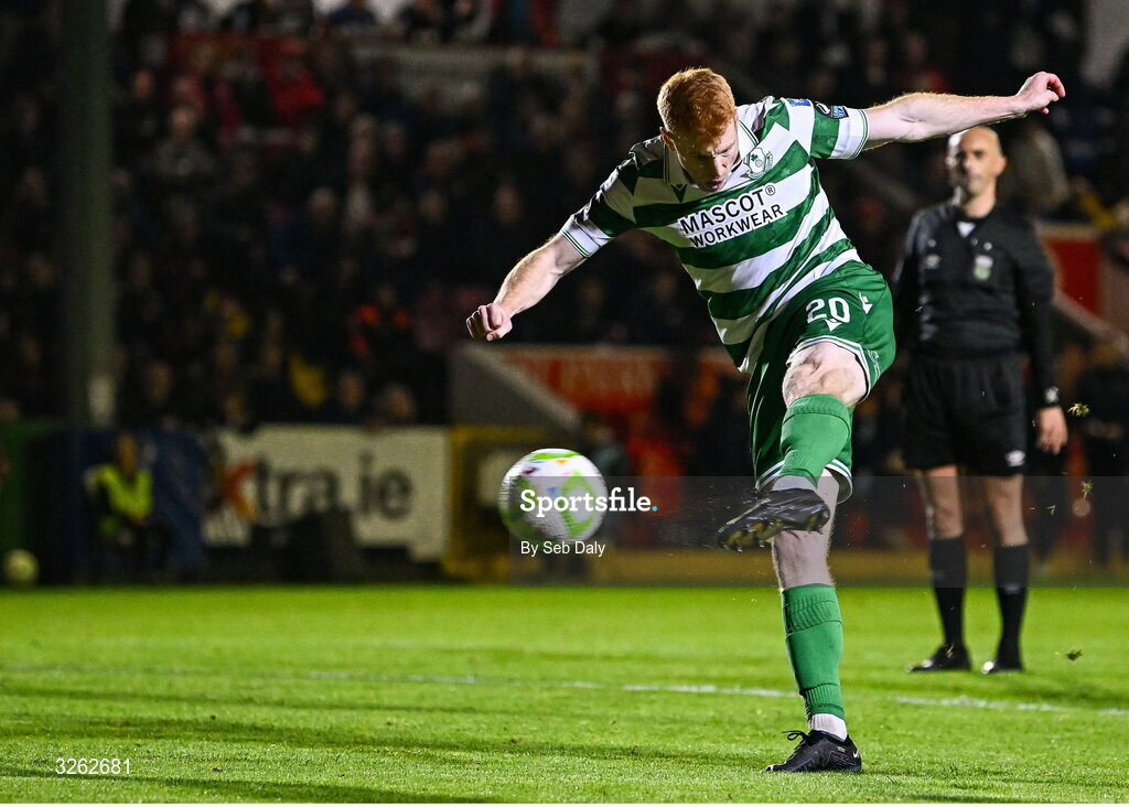 17 October 2025; Rory Gaffney of Shamrock Rovers shoots at goal during the SSE Airtricity Men's Premier Division match between St Patrick's Athletic and Shamrock Rovers at Richmond Park in Dublin. Photo by Seb Daly/Sportsfile