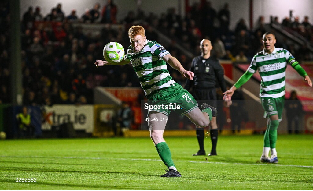 17 October 2025; Rory Gaffney of Shamrock Rovers shoots at goal during the SSE Airtricity Men's Premier Division match between St Patrick's Athletic and Shamrock Rovers at Richmond Park in Dublin. Photo by Seb Daly/Sportsfile