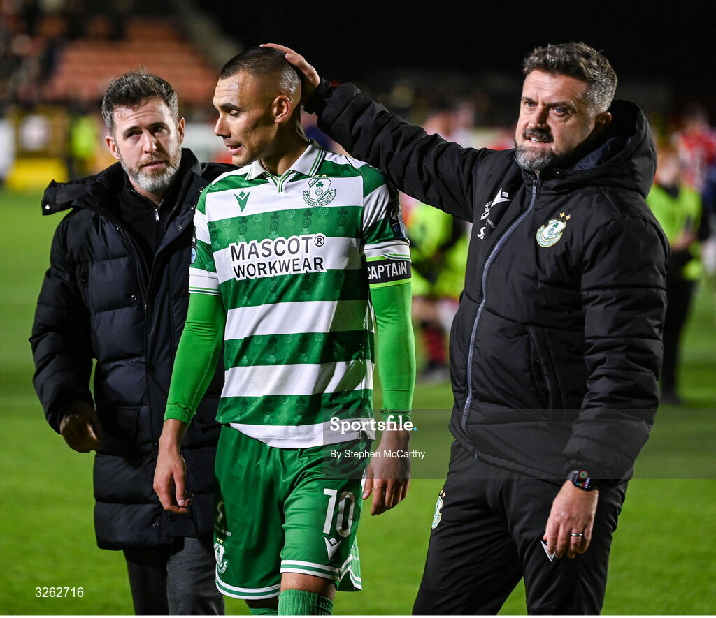 17 October 2025; Graham Burke of Shamrock Rovers with sporting director Stephen McPhail, right, and manager Stephen Bradley after the SSE Airtricity Men's Premier Division match between St Patrick's Athletic and Shamrock Rovers at Richmond Park in Dublin. Photo by Stephen McCarthy/Sportsfile