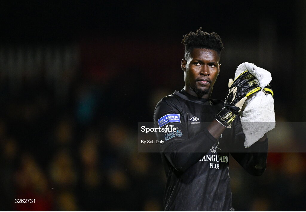 17 October 2025; St Patrick's Athletic goalkeeper Joseph Anang after his side's victory in the SSE Airtricity Men's Premier Division match between St Patrick's Athletic and Shamrock Rovers at Richmond Park in Dublin. Photo by Seb Daly/Sportsfile