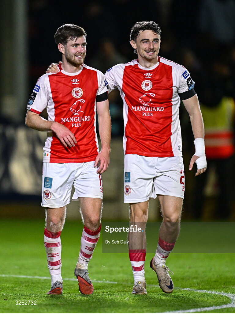 17 October 2025; St Patrick's Athletic players Barry Baggley, left, and Simon Power after their side's victory in the SSE Airtricity Men's Premier Division match between St Patrick's Athletic and Shamrock Rovers at Richmond Park in Dublin. Photo by Seb Daly/Sportsfile