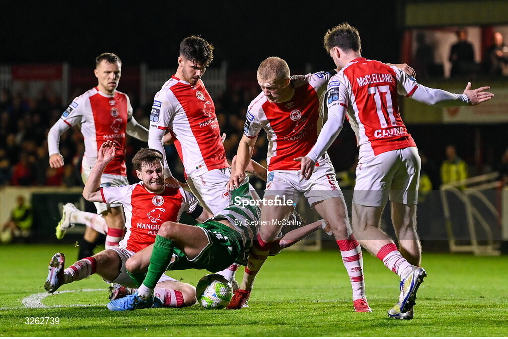 17 October 2025; Danny Mandroiu of Shamrock Rovers in action against St Patrick's Athletic players, from left, Jamie Lennon, Barry Baggley, Darren Robinson, Tom Grivosti and Jay McClelland, 11, during the SSE Airtricity Men's Premier Division match between St Patrick's Athletic and Shamrock Rovers at Richmond Park in Dublin. Photo by Stephen McCarthy/Sportsfile
