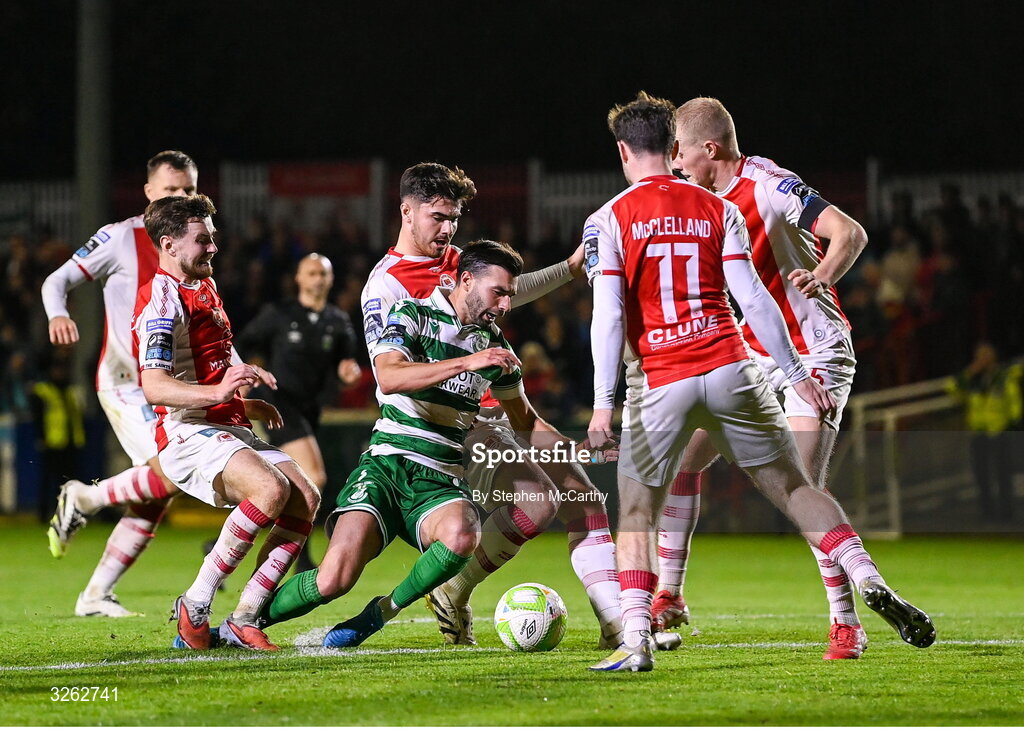17 October 2025; Danny Mandroiu of Shamrock Rovers in action against St Patrick's Athletic players, from left, Barry Baggley, Darren Robinson, Jay McClelland, 11, and Tom Grivosti during the SSE Airtricity Men's Premier Division match between St Patrick's Athletic and Shamrock Rovers at Richmond Park in Dublin. Photo by Stephen McCarthy/Sportsfile