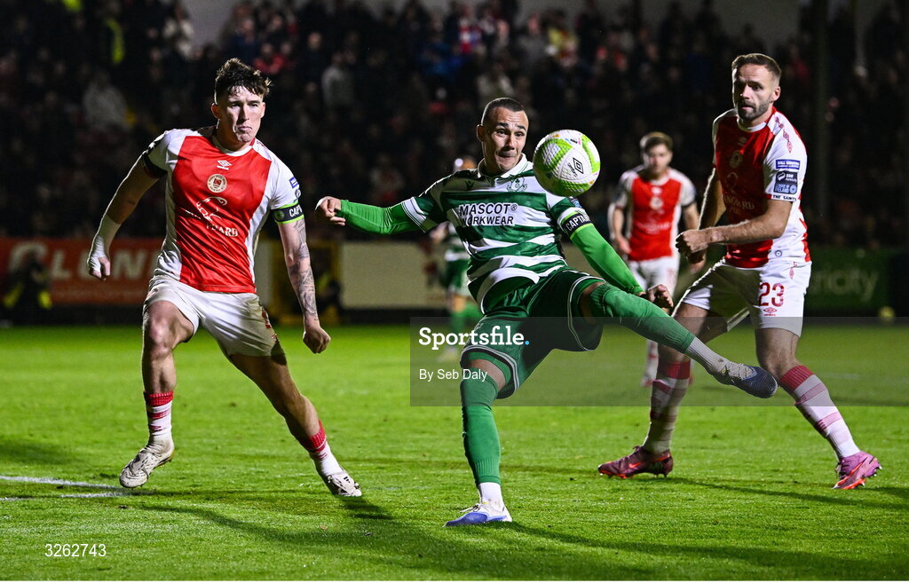 17 October 2025; Graham Burke of Shamrock Rovers in action against Joe Redmond of St Patrick's Athletic during the SSE Airtricity Men's Premier Division match between St Patrick's Athletic and Shamrock Rovers at Richmond Park in Dublin. Photo by Seb Daly/Sportsfile