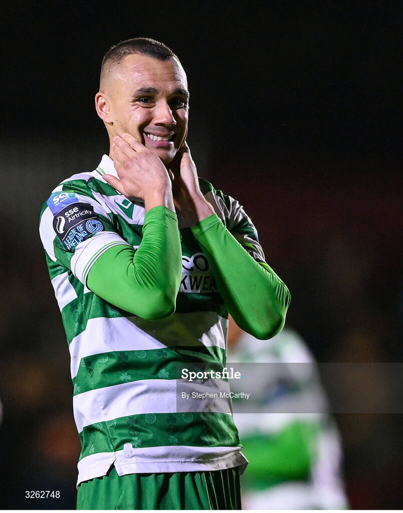 17 October 2025; Graham Burke of Shamrock Rovers reacts to a missed opportunity on goal during the SSE Airtricity Men's Premier Division match between St Patrick's Athletic and Shamrock Rovers at Richmond Park in Dublin. Photo by Stephen McCarthy/Sportsfile