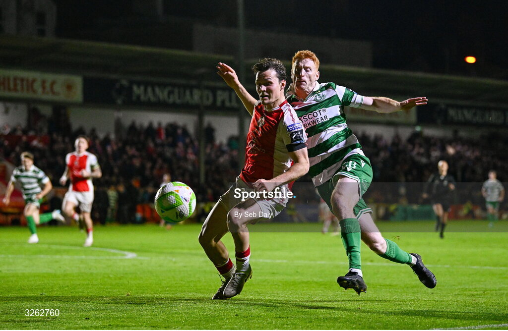 17 October 2025; Axel Sjoberg of St Patrick's Athletic in action against Rory Gaffney of Shamrock Rovers during the SSE Airtricity Men's Premier Division match between St Patrick's Athletic and Shamrock Rovers at Richmond Park in Dublin. Photo by Seb Daly/Sportsfile