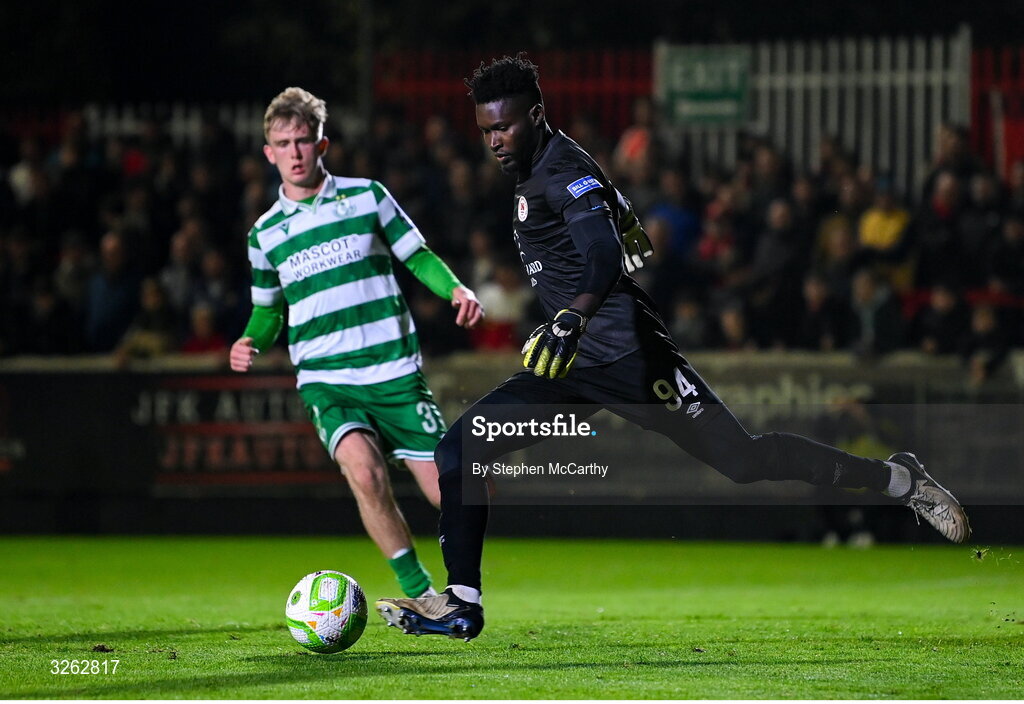 17 October 2025; St Patrick's Athletic goalkeeper Joseph Anang in action against Michael Noonan of Shamrock Rovers during the SSE Airtricity Men's Premier Division match between St Patrick's Athletic and Shamrock Rovers at Richmond Park in Dublin. Photo by Stephen McCarthy/Sportsfile