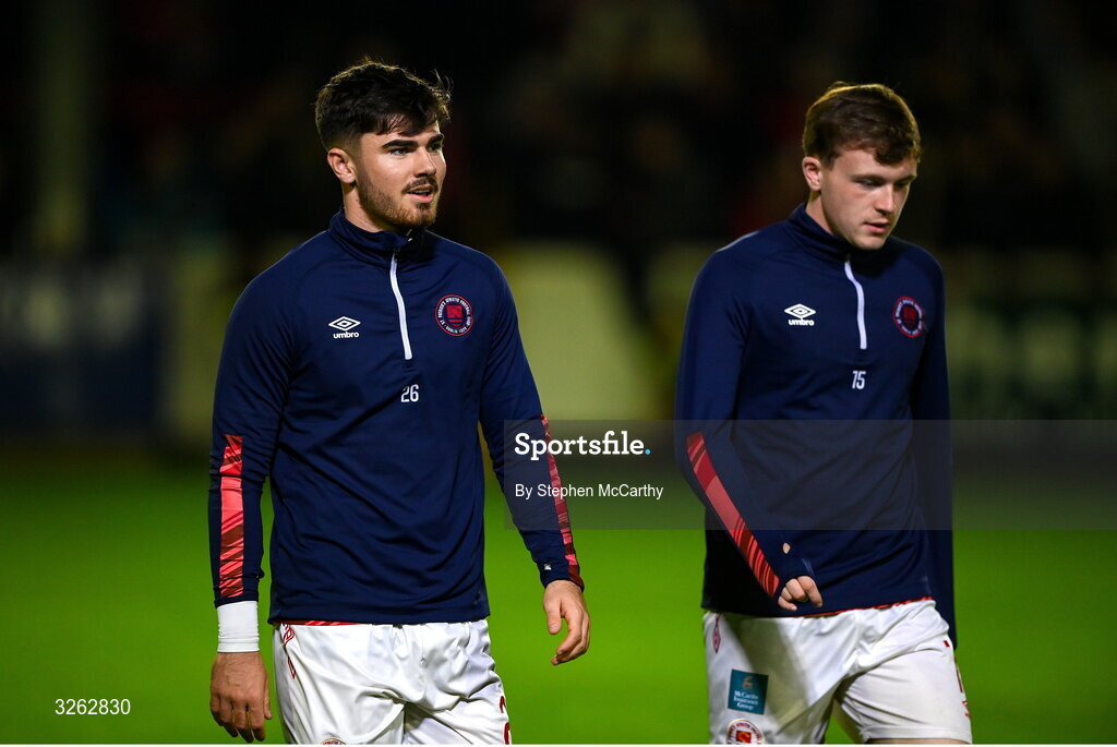 17 October 2025; Darren Robinson, left, and Conor Carty of St Patrick's Athletic before the SSE Airtricity Men's Premier Division match between St Patrick's Athletic and Shamrock Rovers at Richmond Park in Dublin. Photo by Stephen McCarthy/Sportsfile