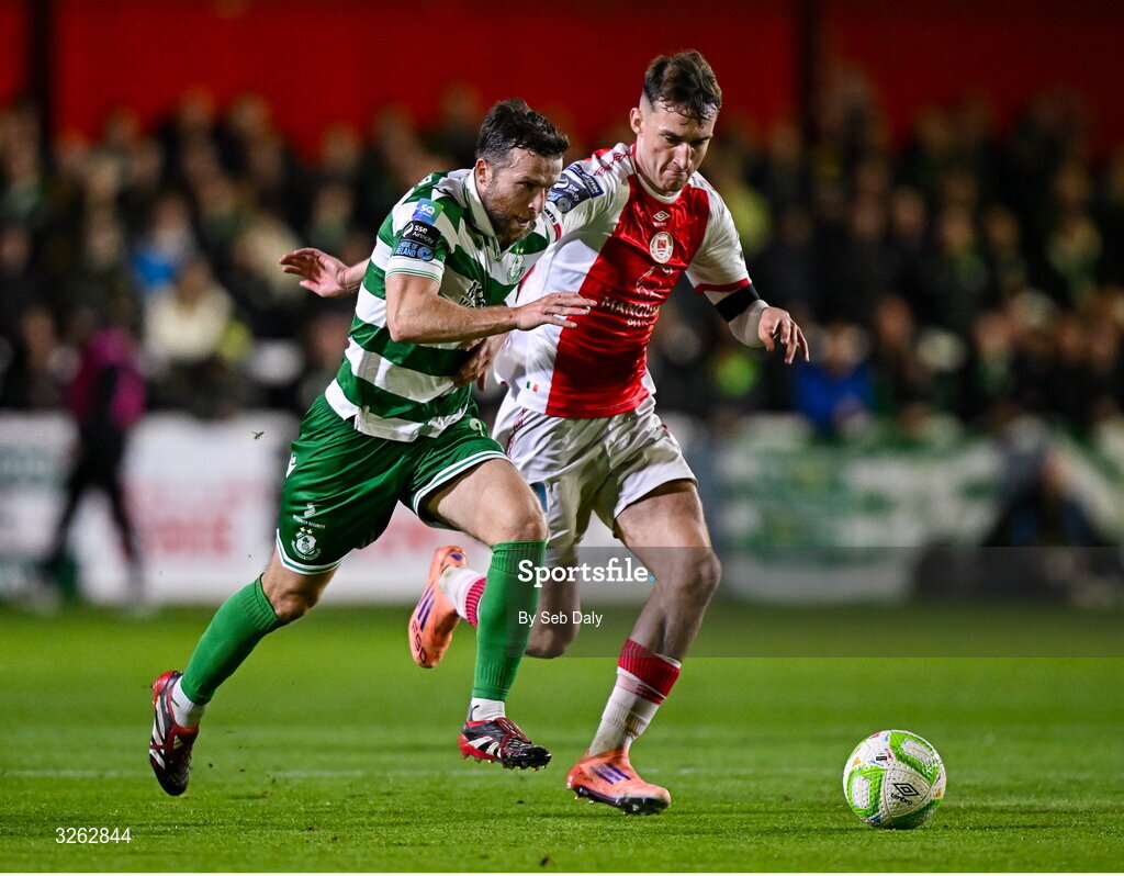 17 October 2025; Adam Matthews of Shamrock Rovers in action against Mason Melia of St Patrick's Athletic during the SSE Airtricity Men's Premier Division match between St Patrick's Athletic and Shamrock Rovers at Richmond Park in Dublin. Photo by Seb Daly/Sportsfile