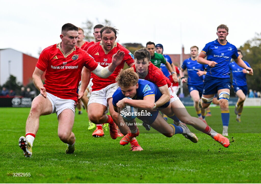18 October 2025; Caspar Gabriel of Leinster dives over to score his side's second try despite the efforts of Jake O’Riordan of Munster during the Interprovincial "A" Rugby Championship match between Leinster A and Munster A at Ollie Campbell Park in Dublin. Photo by Tyler Miller/Sportsfile
