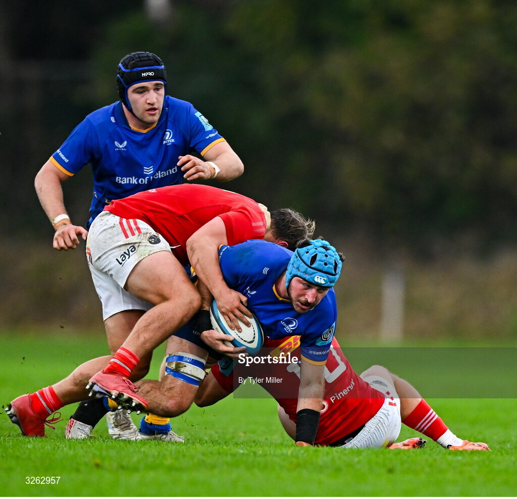 18 October 2025; Will Connors of Leinster is tackled by Max Clein, left, and Tony Butler of Munster during the Interprovincial "A" Rugby Championship match between Leinster A and Munster A at Ollie Campbell Park in Dublin. Photo by Tyler Miller/Sportsfile