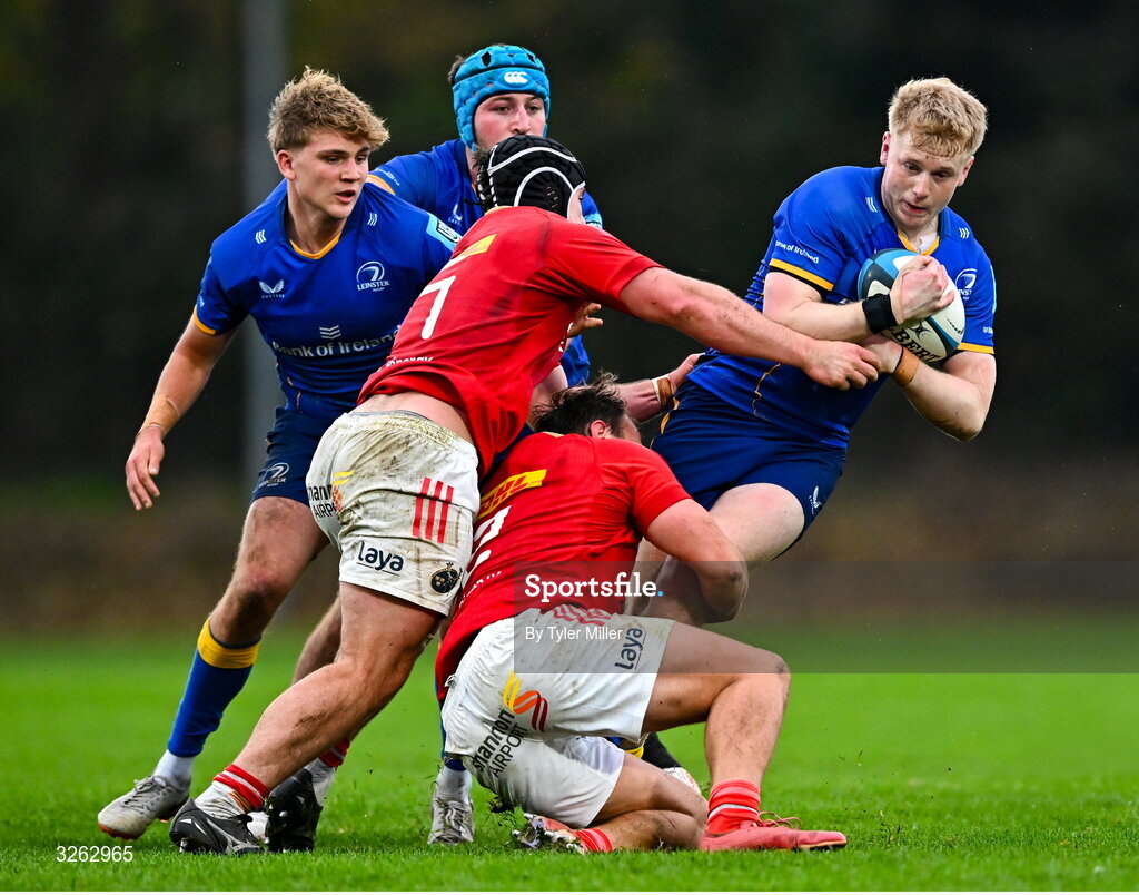 18 October 2025; Andrew Osborne of Leinster is tackled by Oisín Minogue, left, and Max Clein of Munster during the Interprovincial "A" Rugby Championship match between Leinster A and Munster A at Ollie Campbell Park in Dublin. Photo by Tyler Miller/Sportsfile