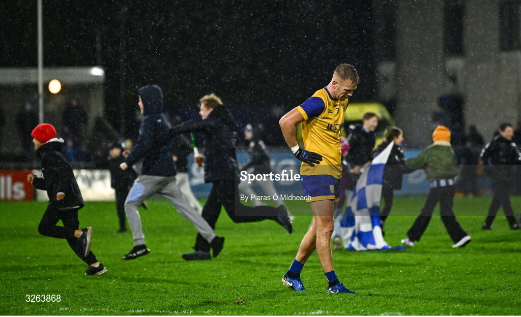 18 October 2025; Ballyboden St Enda's supporters run onto the pitch after their side's victory, past Jonny Cooper of Na Fianna, after the Dublin County Senior Club Football Championship final match between Ballyboden St Enda's and Na Fianna at Parnell Park in Dublin. Photo by Piaras Ó Mídheach/Sportsfile