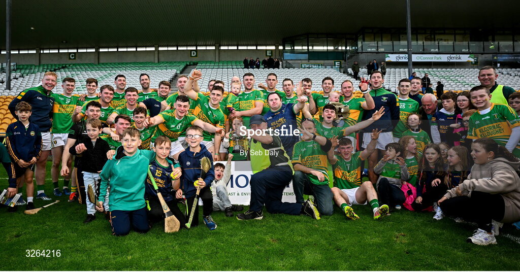 19 October 2025; Kilcormac-Killoughey players and supporters celebrate with the Sean Robbins Cup after their side's victory in the Offaly County Senior Club Hurling Championship final match between Kilcormac-Killoughey and Shinrone at Glenisk O'Connor Park in Tullamore, Offaly. Photo by Seb Daly/Sportsfile