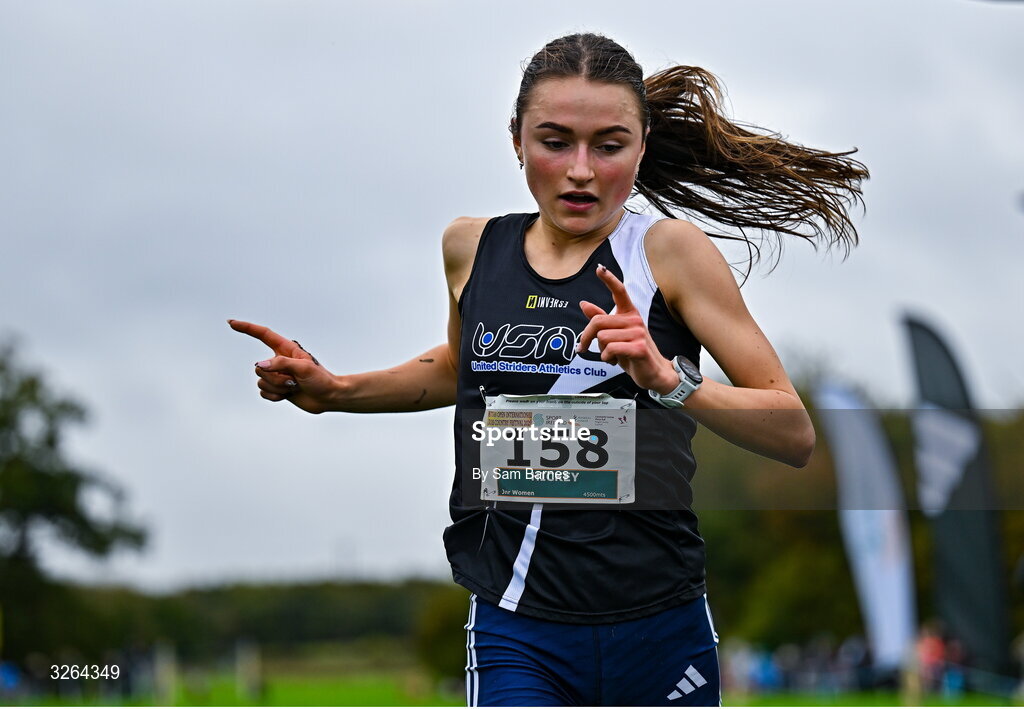 19 October 2025; Emma Hickey of United Striders AC, celebrates winning the junior women's 4500m during the National Autumn Cross County & Relays at the Sport Ireland National Cross Country Track in Abbotstown, Dublin. Photo by Sam Barnes/Sportsfile