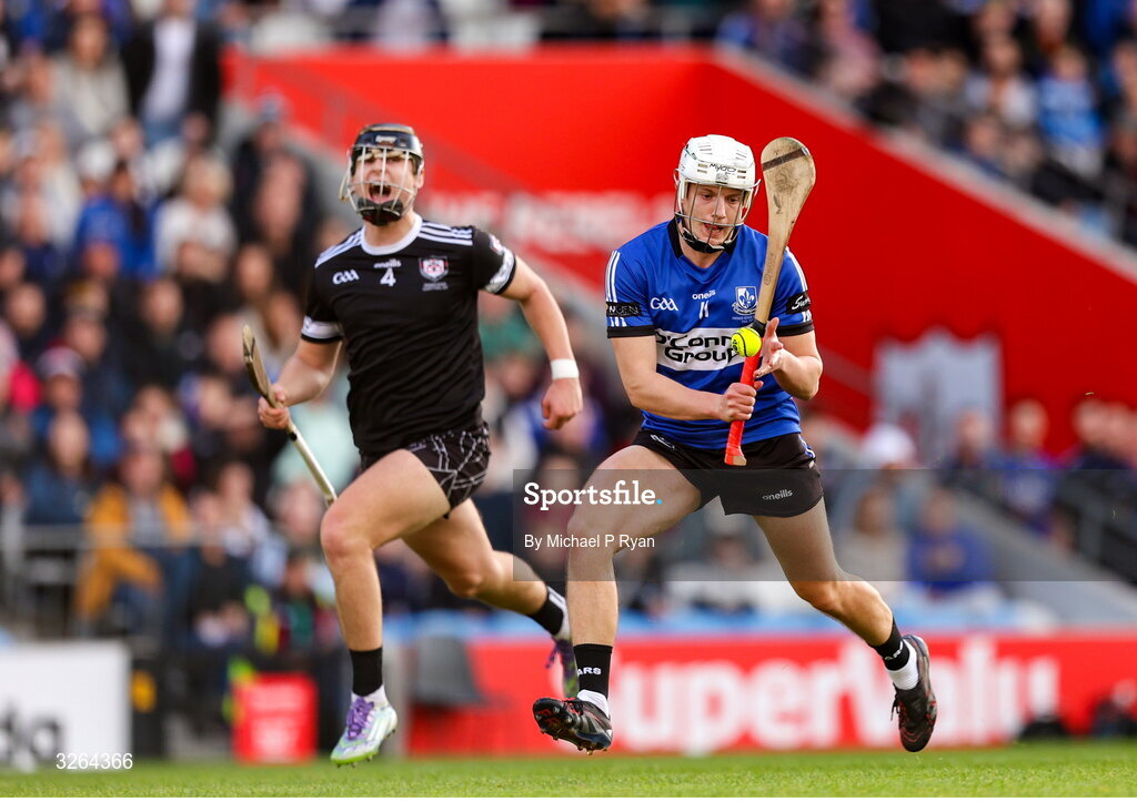 19 October 2025; Colm McCarthy of Sarsfields in action against Tadhg O'Leary Hayes of Midleton during the Cork County Senior Club Hurling Championship final match between Sarsfields and Midleton at SuperValu Páirc Uí Chaoimh in Cork. Photo by Michael P Ryan/Sportsfile