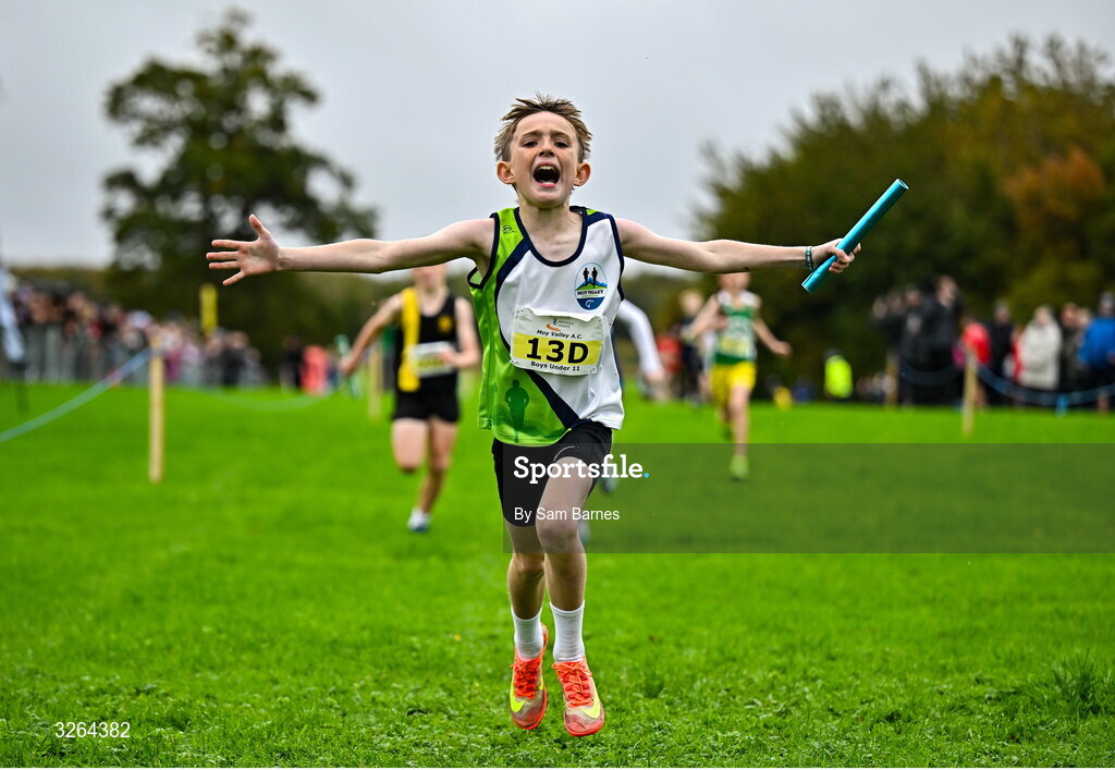 19 October 2025; Kyle Molloy of Moy Valley AC, celebrates finishing second in the U11 Boys 4x500m Relay during the National Autumn Cross County & Relays at the Sport Ireland National Cross Country Track in Abbotstown, Dublin. Photo by Sam Barnes/Sportsfile