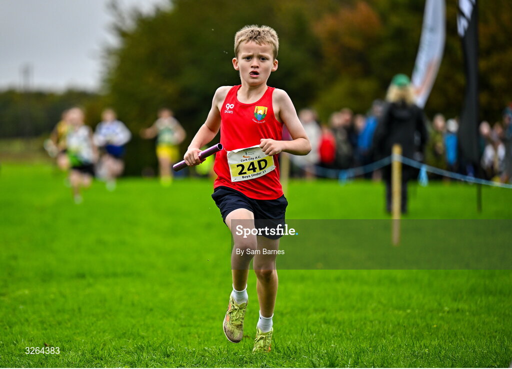 19 October 2025; Freddie Hallahan of Cork City AC crosses the line to win the U11 Boys 4x500m Relay during the National Autumn Cross County & Relays at the Sport Ireland National Cross Country Track in Abbotstown, Dublin. Photo by Sam Barnes/Sportsfile