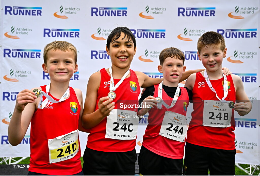 19 October 2025; The Cork City AC team, from left Freddie Hallahan, Rueben O'Connell, Tom Devereux and JD Manning, with their gold medals after winning the Boy's U11 4x500m relay during the National Autumn Cross County & Relays at the Sport Ireland National Cross Country Track in Abbotstown, Dublin. Photo by Sam Barnes/Sportsfile