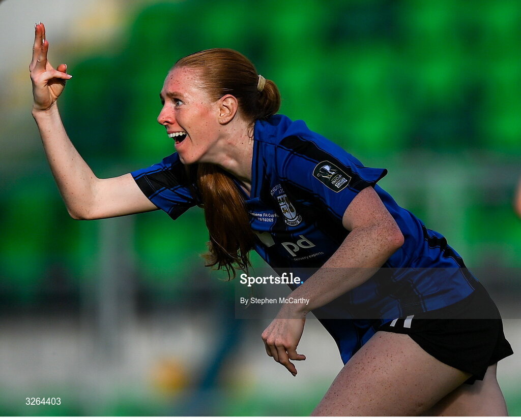 19 October 2025; Kelly Brady of Athlone Town celebrates after scoring her, and her side's, third goal during the 2025 Sports Direct Women's FAI Cup Final match between Athlone Town and Bohemians at Tallaght Stadium in Dublin. Photo by Stephen McCarthy/Sportsfile
