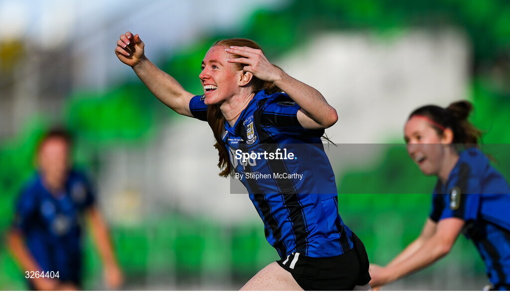 19 October 2025; Kelly Brady of Athlone Town celebrates after scoring her, and her side's, third goal during the 2025 Sports Direct Women's FAI Cup Final match between Athlone Town and Bohemians at Tallaght Stadium in Dublin. Photo by Stephen McCarthy/Sportsfile