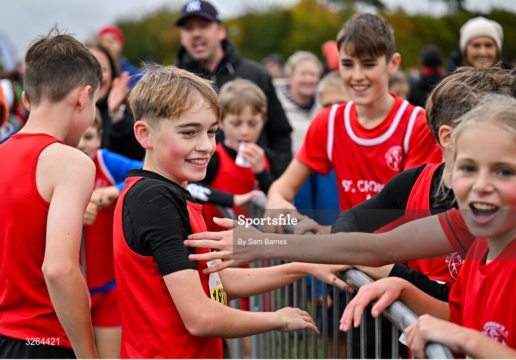 19 October 2025; Loughlin Downes of St Cronans AC, Clare, celebrates with teammate after winning the U12 Mixed 4x500m relay during the National Autumn Cross County & Relays at the Sport Ireland National Cross Country Track in Abbotstown, Dublin. Photo by Sam Barnes/Sportsfile