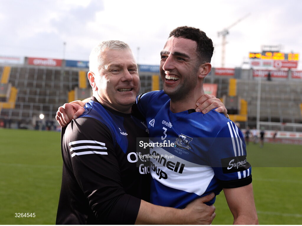 19 October 2025; Sarsfields coach Diarmuid O'Sullivan, left, with Cillian Roche celebrate after the Cork County Senior Club Hurling Championship final match between Sarsfields and Midleton at SuperValu Páirc Uí Chaoimh in Cork. Photo by Michael P Ryan/Sportsfile