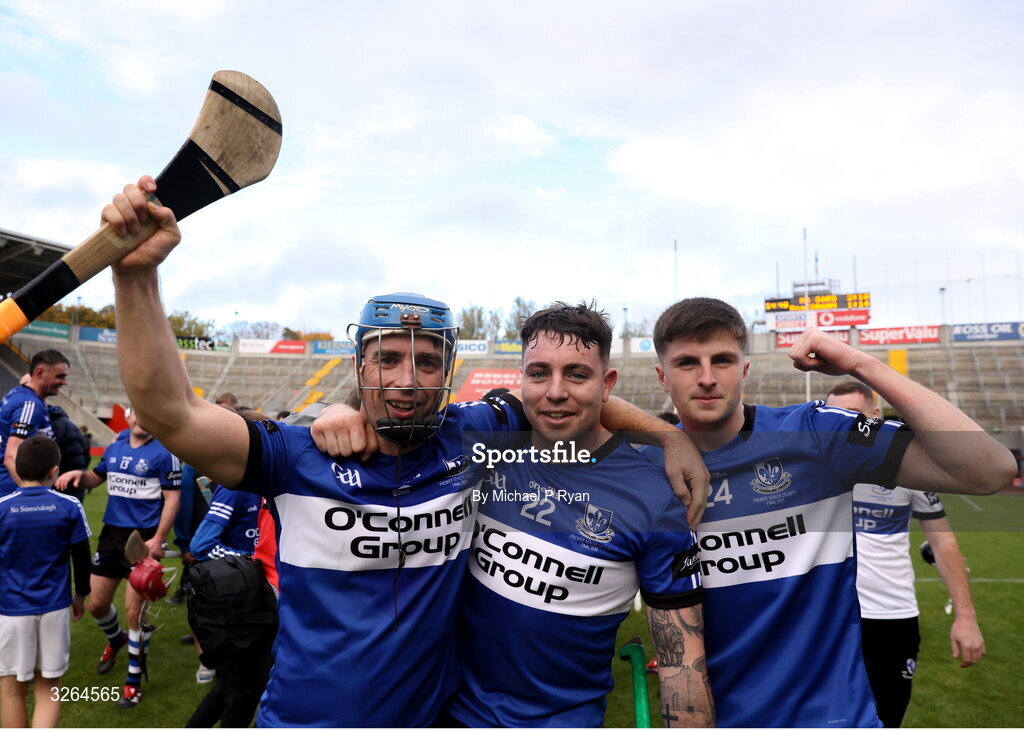 19 October 2025; Sarsfields players, from left, Conor O'Sullivan, Shane O'Regan, and Sam McNamara celebrate after the Cork County Senior Club Hurling Championship final match between Sarsfields and Midleton at SuperValu Páirc Uí Chaoimh in Cork. Photo by Michael P Ryan/Sportsfile