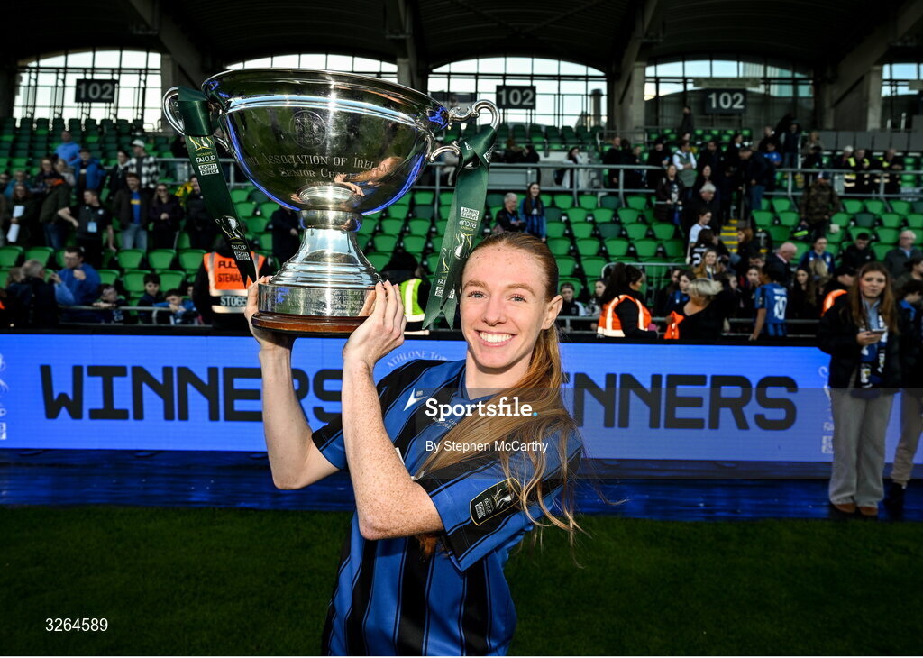 19 October 2025; Kelly Brady of Athlone Town celebrates with the FAI Cup after the 2025 Sports Direct Women's FAI Cup Final match between Athlone Town and Bohemians at Tallaght Stadium in Dublin. Photo by Stephen McCarthy/Sportsfile