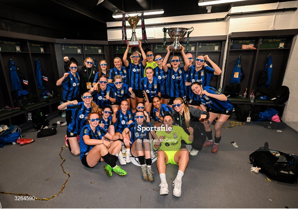 19 October 2025; Athlone Town players celebrate after the 2025 Sports Direct Women's FAI Cup Final match between Athlone Town and Bohemians at Tallaght Stadium in Dublin. Photo by Stephen McCarthy/Sportsfile