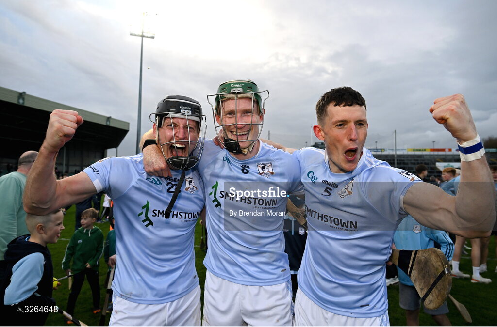 19 October 2025; Na Piarsaigh players, from left, Conor Boylan, William O'Donoghue and Mike Foley celebrate after the Limerick County Senior Club Hurling Championship final match between Doon and Na Piarsaigh at TUS Gaelic Grounds in Limerick. Photo by Brendan Moran/Sportsfile