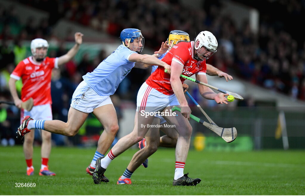 19 October 2025; Kevin Maher of Doon is tackled by Mike Casey and Tommy Grimes of Na Piarsaigh during the Limerick County Senior Club Hurling Championship final match between Doon and Na Piarsaigh at TUS Gaelic Grounds in Limerick. Photo by Brendan Moran/Sportsfile