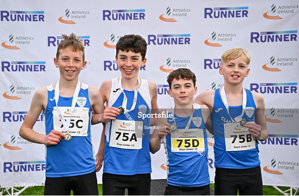 19 October 2025; The Claremorris AC, Mayo, U13 Boys 4x500m Relay team, from left, Harry Mulkeen, Luke Duffy, Phillip Griffin and Dean Kirrane, pictured with their gold medals during the National Autumn Cross County & Relays at the Sport Ireland National Cross Country Track in Abbotstown, Dublin. Photo by Sam Barnes/Sportsfile