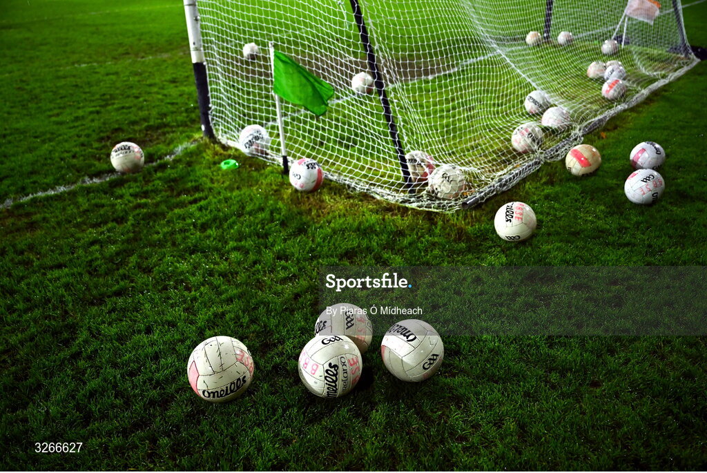 18 October 2025; A general view of footballs on the pitch for the Ballyboden St Enda's warm-up before the Dublin County Senior Club Football Championship final match between Ballyboden St Enda's and Na Fianna at Parnell Park in Dublin. Photo by Piaras Ó Mídheach/Sportsfile