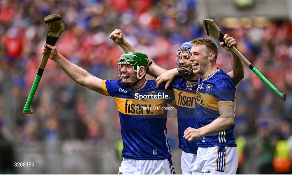 20 July 2025; Tipperary hurlers the McGrath brothers, from left, Noel, John and Brian after their side's victory the GAA Hurling All-Ireland Senior Championship final match between Cork and Tipperary at Croke Park in Dublin. Photo by Piaras Ó Mídheach/Sportsfile
